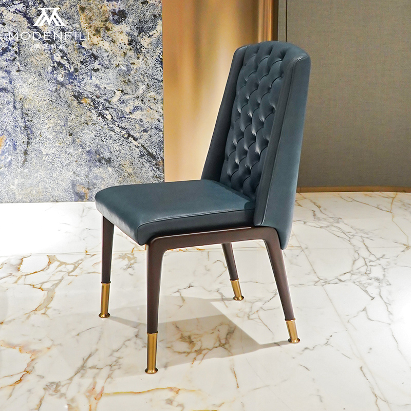 The MODENFILI SM001 dining chair is a perfect blend of luxury and comfort, designed to enhance your dining experience. This elegant chair features a tufted backrest and a plush seat cushion, upholstered in high-quality navy blue leather, providing both style and support. The dark wooden legs with gold accents add a touch of sophistication, making the SM001 an ideal choice for modern and traditional dining rooms alike. Whether you're hosting a dinner party or enjoying a quiet meal, this chair ensures that you do so in comfort and style. Upgrade your dining space with the MODENFILI SM001, where luxury meets functionality.