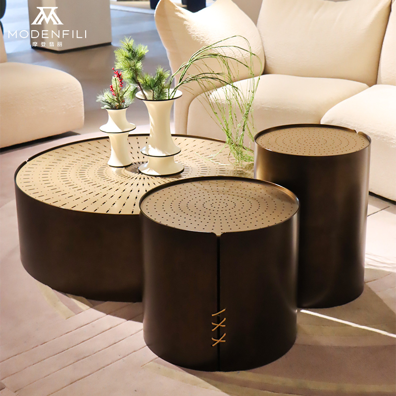 The MODENFILI V2229H1B is a contemporary round coffee table set that brings a sense of modern elegance and luxury to your living space. This set includes two tables, each with a distinctive design that features a dark brown finish and a perforated top, adding a unique textural element to your room's decor. The tables are not only stylish but also functional, providing ample space for placing decorative items, serving refreshments, or using them as workspaces. The V2229H1B's sturdy construction ensures durability, while its sleek design complements a variety of interior styles, from minimalist to eclectic. The tables' bases are crafted from high-quality materials, ensuring stability and adding to the overall aesthetic. The MODENFILI V2229H1B is designed for those who appreciate modern design and wish to incorporate functional, stylish elements into their home decor. Its combination of materials and colors makes it a versatile piece that can adapt to various styles, enhancing the ambiance of your living area. Whether you're hosting a social gathering or enjoying a quiet evening at home, this table set provides both style and utility, making it an essential addition to any discerning homeowner's collection. The V2229H1B is more than just a coffee table; it's a statement piece that reflects your refined taste and appreciation for quality craftsmanship.