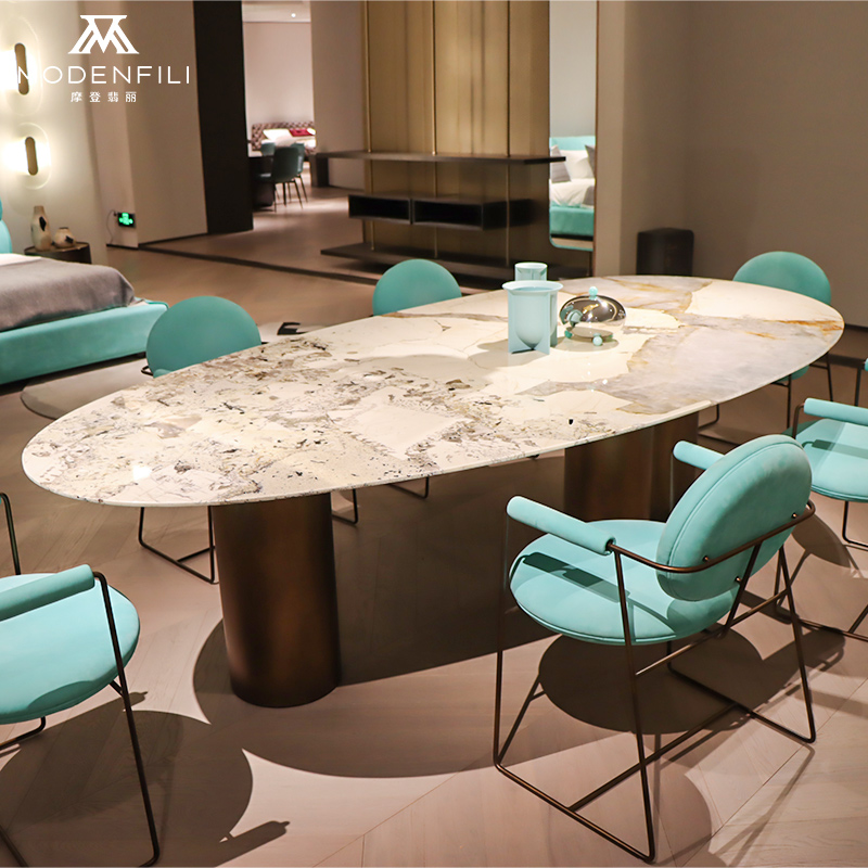 The MODENFILI V2215D2 dining table is a stunning centerpiece that brings a sense of modern luxury and elegance to any dining area. This marble table features a rich, natural stone surface that adds a touch of sophistication and warmth to your decor, while its plush cushions provide the ultimate in comfort for dining and conversation. The V2215D2 is designed with a sleek silhouette that complements minimalist and modern interiors, showcasing clean lines and a minimalist aesthetic that is both stylish and timeless. The table's sturdy frame, made from high-quality materials, ensures durability and stability, while the soft fabric upholstery adds a touch of luxury to the overall design. This dining table is not just a place to eat; it's a statement piece that reflects your refined taste and appreciation for quality craftsmanship. Whether you're looking to create a cozy family dining area or a stylish seating arrangement in your kitchen, the MODENFILI V2215D2 table offers a comfortable and inviting experience that is both stylish and restful. Its combination of comfort, style, and functionality makes it an essential piece for any home aspiring to achieve a high-end, contemporary look. The V2215D2 is designed for those who value both form and function in their furniture choices, offering a sophisticated and modern look that elevates any room. Whether you're hosting a social gathering or enjoying a quiet dinner at home, this table provides both style and utility, making it an essential addition to any discerning homeowner's collection.