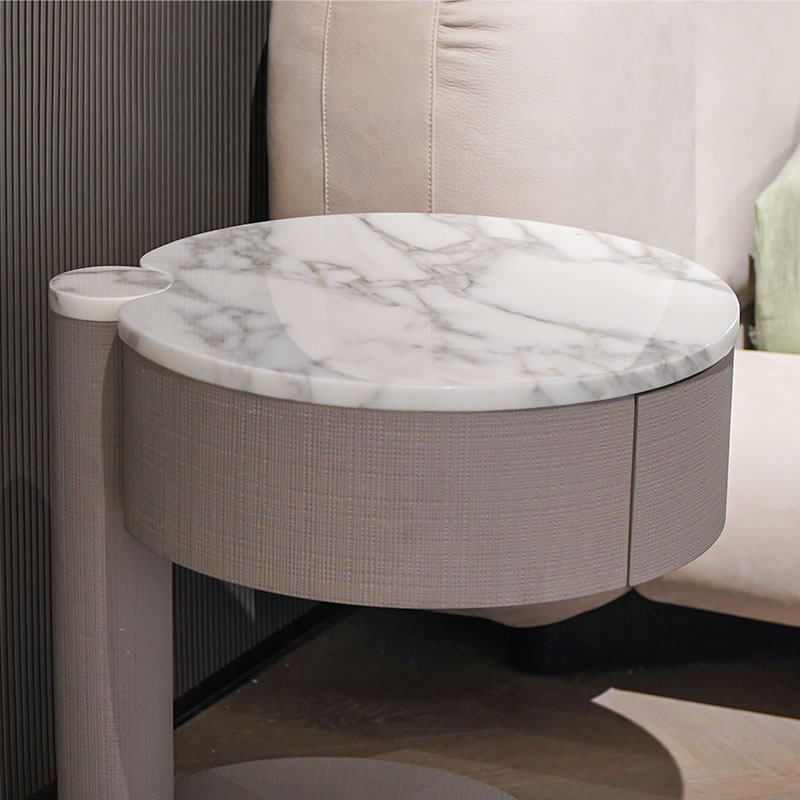 The V2202B3 nightstand is designed with a sleek, contemporary look, featuring a light gray fabric base that adds a soft touch to the overall design. The round shape of the nightstand makes it versatile, fitting seamlessly into any corner of your bedroom, whether next to a bed or as a standalone piece in your living space.