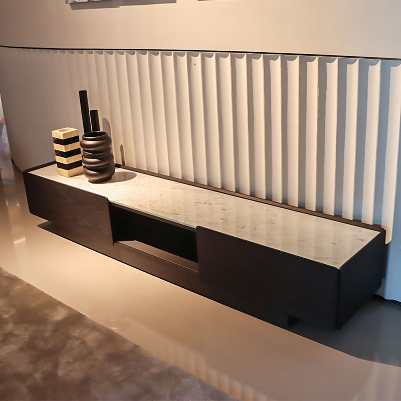 The S3302H8 TV stand is designed with a minimalist aesthetic, featuring a dark wood finish that complements the marble top and adds a touch of sophistication to your living room. The stand's low-profile design ensures that it doesn't overpower your space, while its ample storage space, including a central cut-out for cable management, keeps your entertainment area organized and clutter-free.