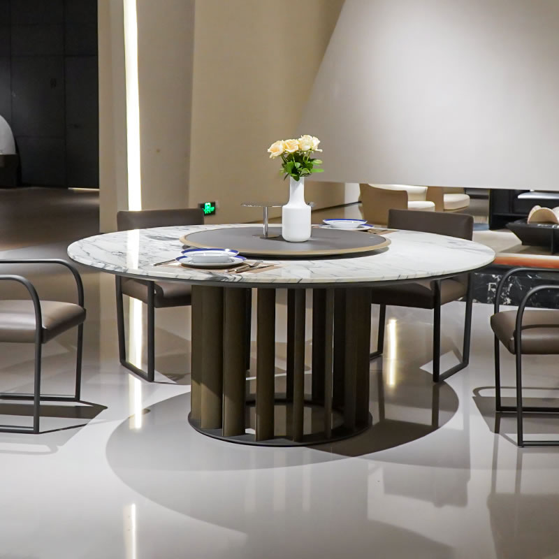 The S3311B1 modern marble round dining table is designed to be the focal point of your dining area, offering both elegance and functionality. This table features a stunning white marble top with gray veining, providing a durable and luxurious surface for your dining needs. The round shape of the table promotes a sense of unity and inclusivity, making it perfect for family meals or entertaining guests.