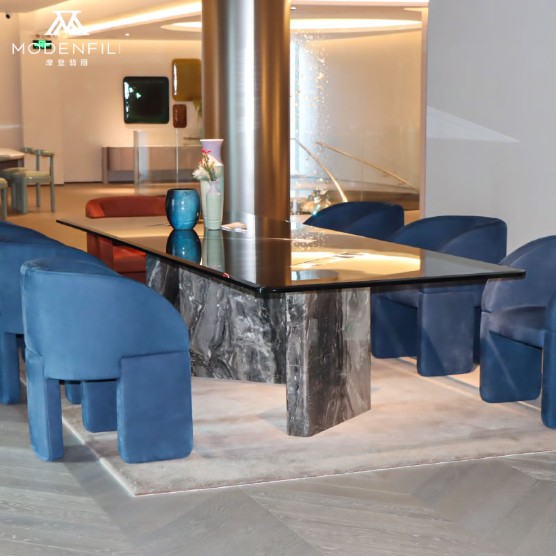 The V2229D2 modern rectangular dining table is a statement piece that combines functionality with a sleek, contemporary design. This table features a striking black glass top that offers a durable and elegant surface for dining, while the marble-patterned base adds a touch of luxury and stability. The unique design of the base, with its marble-like appearance, enhances the table's visual appeal and complements various interior styles.