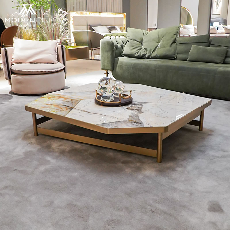 The MODENFILI SM016-3 hexagonal marble coffee table is a luxurious addition to any living room, offering both style and functionality. This unique table features a stunning marble top with elegant veining, set within a sleek, gold-finished frame that enhances its visual appeal. The hexagonal shape provides a modern twist to traditional coffee table designs, making it a perfect centerpiece for contemporary homes. Ideal for displaying decorative items or serving refreshments, the SM016-3 table combines durability with a chic aesthetic. Elevate your living space with the MODENFILI SM016-3, where luxury meets everyday comfort.
