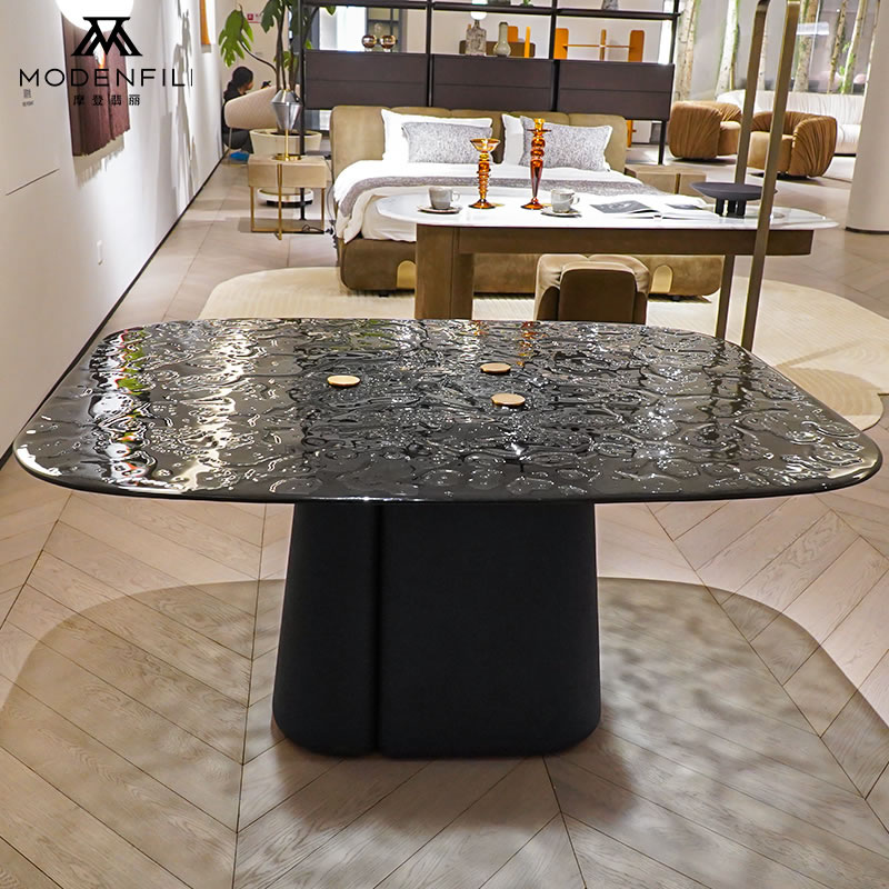 Introduce a touch of modern minimalism to your living room with the MODENFILI V2205D2 coffee table. This table features a clear glass top that showcases an intricate water ripple effect, adding a unique visual interest to your space. The table is supported by a solid, dark gray base that ensures stability and complements the glass top beautifully. The V2205D2 model is perfect for those who appreciate clean lines and contemporary design. It offers a sleek and functional surface for placing drinks, books, or decorative items, making it an ideal centerpiece for any modern living area. Upgrade your home with the MODENFILI V2205D2 coffee table, where simplicity meets sophistication.