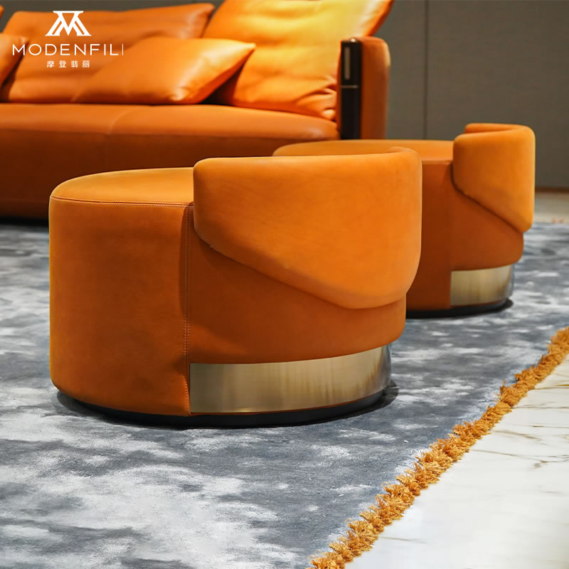 Add a pop of color and comfort to your living space with the MODENFILI SM009 modern round ottoman. This ottoman features a vibrant orange upholstery that brings energy and warmth to any room. The SM009 model is designed with a sleek, round shape that makes it a versatile piece for various uses, from a footrest to an additional seating option. Its plush cushioning ensures maximum comfort, while the sturdy base with a gold finish adds a touch of elegance. Perfect for modern interiors, this ottoman enhances both the functionality and aesthetic appeal of your space. Transform your living area with the MODENFILI SM009, where style meets comfort in a circular silhouette.