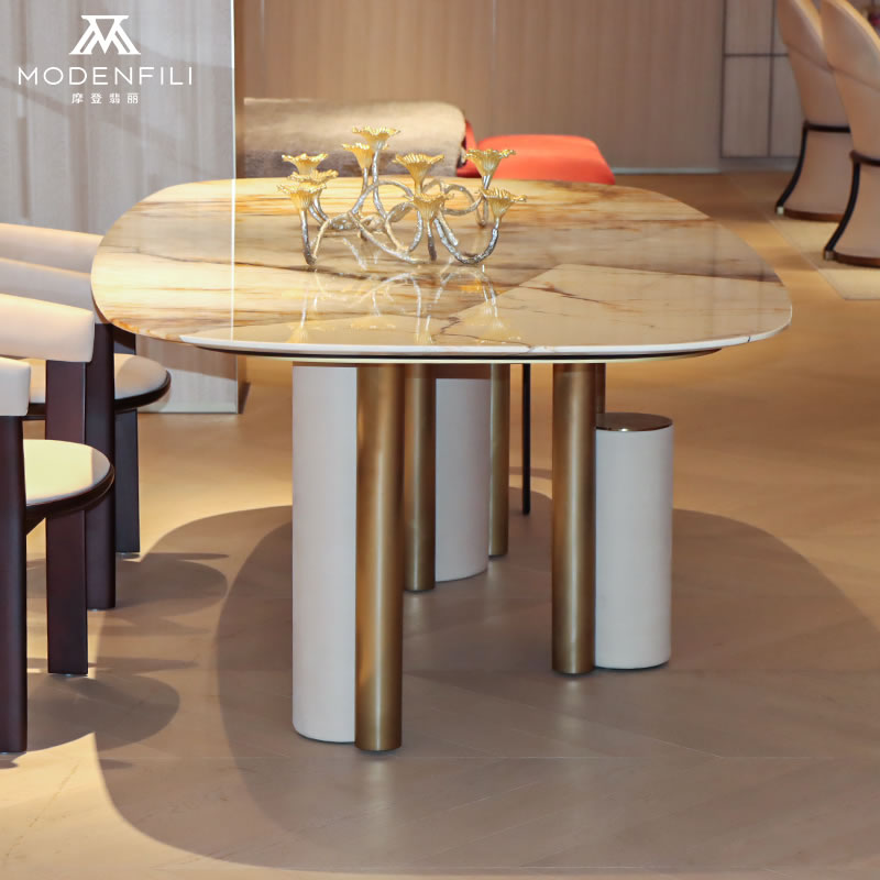 The MODENFILI V2213D2 rectangular marble dining table is a symbol of modern elegance and luxury. This exquisite piece of furniture showcases a stunning marble top with rich, natural patterns that are both eye-catching and unique. The table's design is complemented by a sturdy and stylish base that combines white and gold elements, adding a touch of sophistication to any dining space. The V2213D2 is not just a table; it's a statement piece that brings together form and function, making every meal a memorable experience. Whether you're hosting a formal dinner or enjoying a casual meal with family, this table offers ample space and a beautiful setting. Its robust construction ensures it will withstand the test of time, making it an investment that enhances your home's value and your dining experience. The MODENFILI V2213D2 is perfect for those who appreciate fine design and wish to make a lasting impression with their home decor.