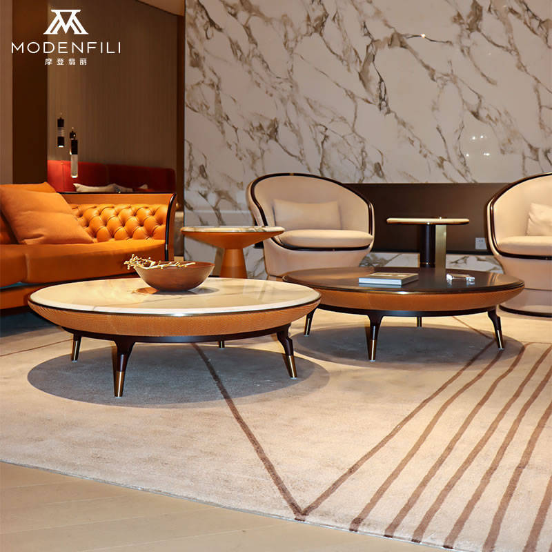 The MODENFILI SM005-1 round coffee table is a testament to modern design and luxury. This exquisite table features a pristine white marble top that offers a timeless appeal, complemented by a bold, dark wood base that exudes sophistication. The brass accents on the table's legs add a touch of opulence, making it a statement piece in any living room. The SM005-1 is designed to be more than just a table; it's a focal point that brings together the best of contemporary and classic styles. Its spacious surface is perfect for displaying decorative items, books, or as a convenient spot for placing drinks and snacks during social gatherings. The table's robust construction ensures durability and longevity, making it an investment that enhances your home's value and your dining experience. The MODENFILI SM005-1 is perfect for those who appreciate fine design and wish to make a lasting impression with their home decor. Its elegant design and high-quality materials make it a must-have for any discerning homeowner looking to create a warm and inviting atmosphere in their living space.