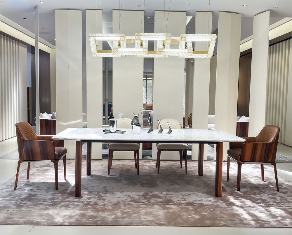 The MODENFILI M9910D2-1 dining table set is a stunning centerpiece for any contemporary dining room, combining the timeless elegance of white marble with the warmth of wooden elements. This table set features a spacious white marble top that not only adds a luxurious touch but also provides a durable and easy-to-clean surface for everyday dining and entertaining.The M9910D2-1 model includes beautifully crafted chairs with a rich, brown wood finish that complements the marble table perfectly. The chairs are designed with a quilted backrest and cushioned seats, offering both comfort and style. The combination of these elements creates a harmonious and inviting dining environment that is perfect for family meals, intimate dinners, or hosting larger gatherings.