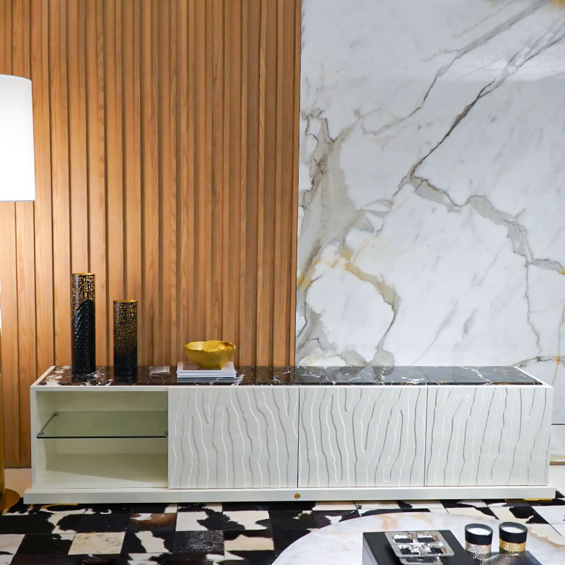 Modern White TV Cabinet M9919H8 with Marble Top and Unique Patterns